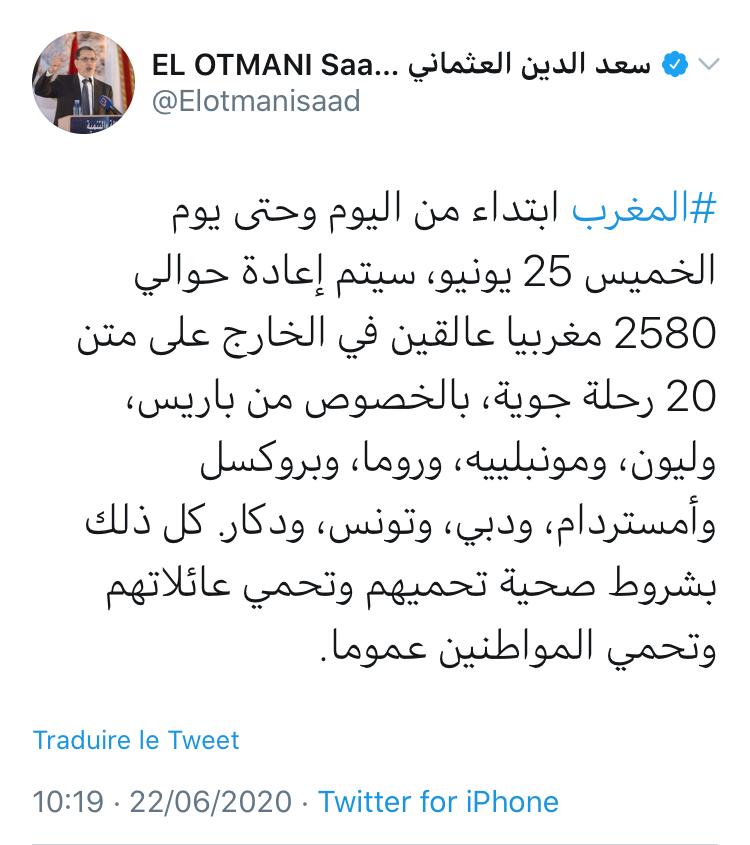 A partir d’aujourd’hui et jusqu’au jeudi prochain, 20 vols de la RAM vont être déployés pour rapatrier quelque 2.580 Marocains bloqués en France, en Belgique, aux Pays-Bas, en Italie, en Tunisie, au Sénégal et aux Émirats arabes unis, indique le Chef du gouvernement dans un tweet.