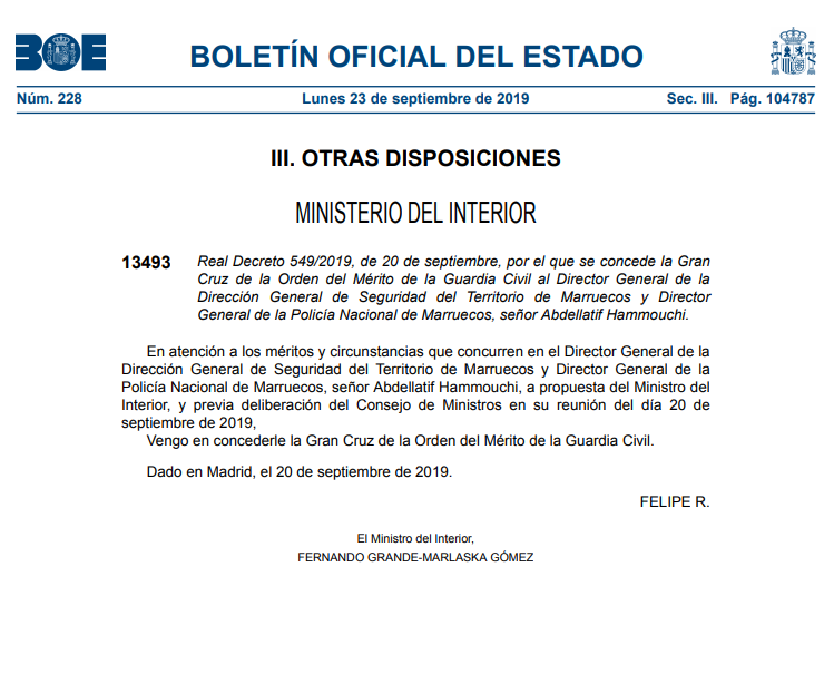 Le gouvernement espagnol a décidé d’attribuer au Directeur général de la Sûreté nationale et Directeur général de la Surveillance du Territoire national, M. Abdellatif Hammouchi, la Grand-Croix de l’Ordre du mérite de la Garde civile.