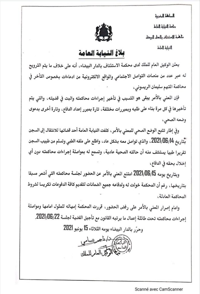 Selon le parquet, Soulaiman Raissouni «retarde l’échéance de son procès à l’appui de plusieurs demandes de remises» niant en même temps que sa santé soit «gravement atteinte». Le parquet a ensuite contesté cette assertion en mentionnant des documents pénitentiaires, dont un certificat médical affirmant le contraire, et indiquant que, selon son dossier, l’état de santé de Raissouni est «normal».