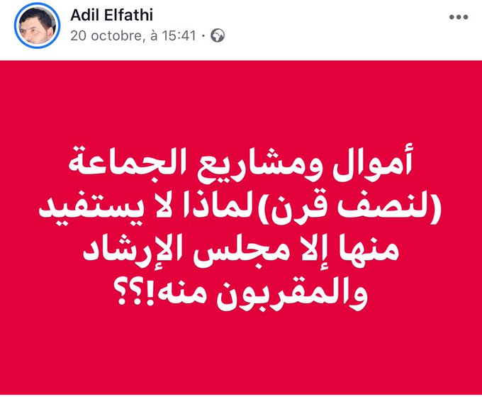 Ce fait, largement relayé dans le cercle des frondeurs de JAOI, suscite une indignation qui se manifeste surtout sur Internet. Une partie des ressources qui alimentent le financement de la formation islamiste sont captés de manière monopolistique par El Moutawakil et sa garde rapprochée, pointe Adil Elfathi