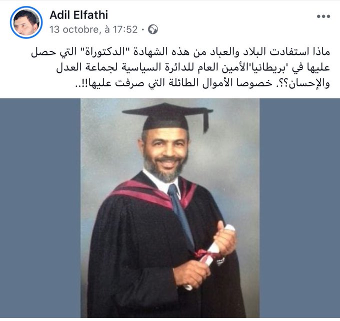 Adil ElFathi, ex-membre de JAOI (jamaa al Adl wal ihsane), a dénoncé, dans des publications sur le réseau social Facebook, les fonds déployés en faveur d’Abdelouahed El Moutawakil, réélu président du cercle politique de la formation à forte tonalité religieuse en 2016. Dans les faits, El Moutawakil a obtenu son grade de docteur en 2010 après avoir soutenu une thèse en droit, spécialité relations internationales. Et de s’interroger : En quoi ce titre universitaire a servi aux pays et aux citoyens, alors que des sommes colossales ont été déboursées pour l’obtenir ?