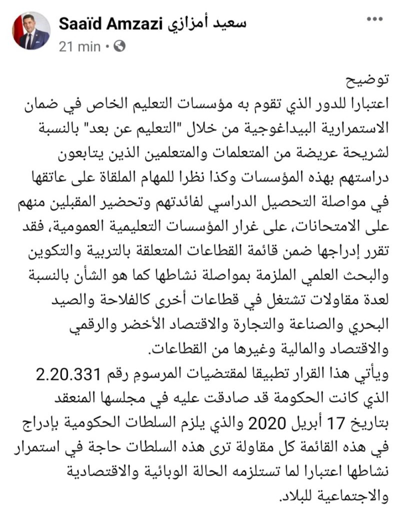 Dans une publication Facebook, le ministre de l’Éducation nationale, de la Formation professionnelle, de l’Enseignement supérieur et de la Recherche scientifique, Saaïd Amzazi, a annoncé que les écoles relevant du secteur de l’enseignement privé doivent assurer la continuité pédagogique à travers l’enseignement à distance.