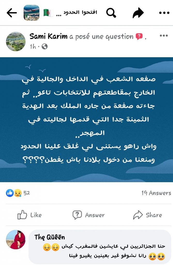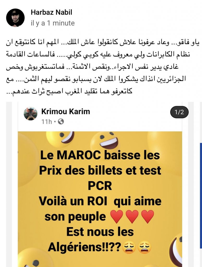 «Sûrement, le caporal algérien va imiter le Maroc et copiera ses dernières décisions afin de pallier l’incompréhension des Algériens privés de billet d’avion pour se rendre à leur pays» a déclaré un internaute. «L’incurie des institutions algériennes est incroyable et les modalités pour entrer sur le territoire national sont très contraignantes. Que fera Abdelmadjid Tebboune pour y remédier ? Je suis Algérienne et je dis vive le roi [Mohammed VI] ?». De nombreux Algériens sont restés bloqués à l’étranger, affrontant parfois des situations dramatiques. Sans famille et sans revenus, certains se sont même retrouvés à la rue. Le nombre d’Algériens encore coincés en Europe sans pouvoir rejoindre l’autre rive de la Méditerranée est encore incertain à cause du black-out des autorités.