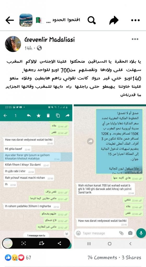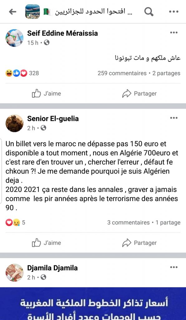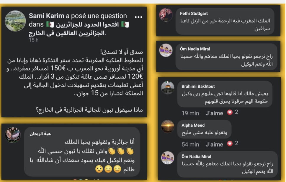 Le roi Mohammed VI a demandé aux compagnies aériennes de mettre en œuvre des prix raisonnables et un nombre de rotations suffisantes afin de permettre aux familles marocaines de l’étranger de pouvoir rentrer au pays pendant les vacances. Pendant ce temps, plusieurs millions d’Algériens de l’étranger composent péniblement avec la fermeture des frontières et la suspension des vols commerciaux et des liaisons maritimes décidées le 17 mars 2020.
