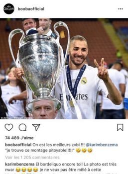 Après la victoire du Real Madrid en finale de la Ligue des Champions ce samedi 3 juin, Booba a posté sur Instagram un photomontage de Karim Benzema avec la coupe aux grandes oreilles sur laquelle il a ajouté les visages de Didier Deschamps, Mathieu Valbuena et Olivuer Giroud .