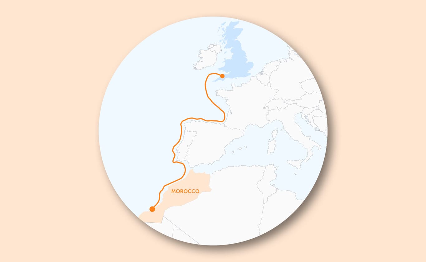 Le câble sous-marin traverse les côtes du Maroc et longe tout le pays jusqu’à se rapprocher du nord au large des côtes de Huelva et du Portugal. De là, il borde tout le Portugal jusqu’à la Galice et toute la côte cantabrique de l’Espagne et même de l’Espagne. De là, il monte au Royaume-Uni. Un projet ambitieux.