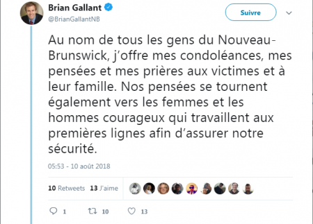 Brian Gallant, premier ministre du Nouveau-Brunswick, a transmis ses condoléances « aux victimes et à leurs familles ».