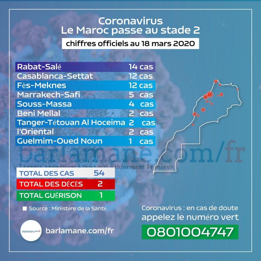 Share Facebook Twitter WhatsApp Telegram Email Copy Link Avec 14 cas sur 54 recensés de contamination au coronavirus, 2 décès et un patient guéri, Rabat-Salé est actuellement le premier foyer de coronavirus au Maroc. Le ministère de la Santé a annoncé avoir recensé 10 nouveaux cas ce 18 mars. 54 cas premier foyer de coronavirus au Maroc Rabat