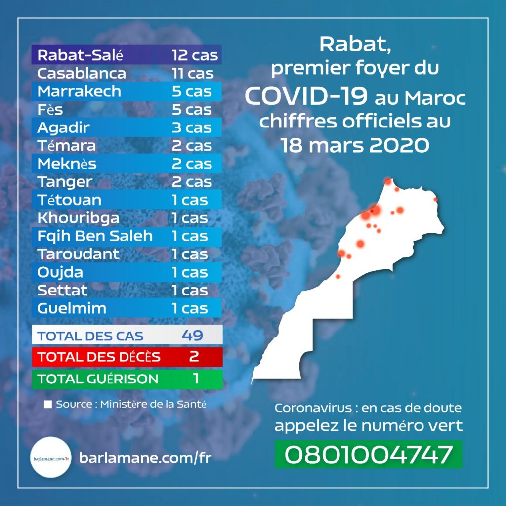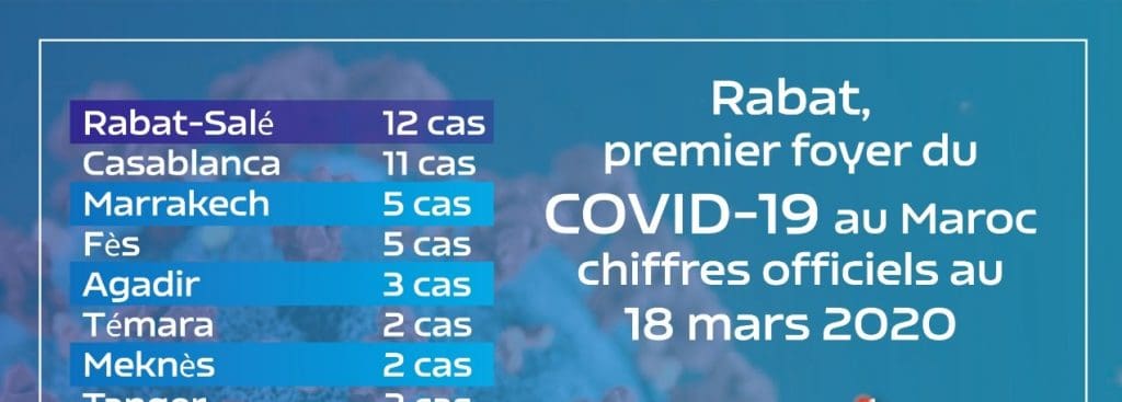 Share Facebook Twitter WhatsApp Telegram Email Copy Link Avec 12 cas sur 49 recensés de contamination au coronavirus, 2 décès et un patient guéri, Rabat-Salé est actuellement le premier foyer de coronavirus au Maroc. Le ministère de la Santé a annoncé avoir recensé 5 nouveaux cas ce 18 mars. 49 cas premier foyer de coronavirus au Maroc Rabat