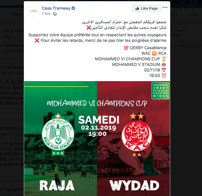 « Casa Tramway » a publié sur sa page Facebook un message dans lequel la compagnie en charge du tramway casablancais incite la Curva Sud (supporters du Raja) et les supporters ultras du Wydad de Casablanca à respecter les autres voyageurs. « Supportez votre équipe préférée tout en respectant les autres voyageurs. Pour éviter les retards, merci de ne pas tirer les poignées d’alarme », peut-on lire sur la page Facebook de « Casa Tramway ».