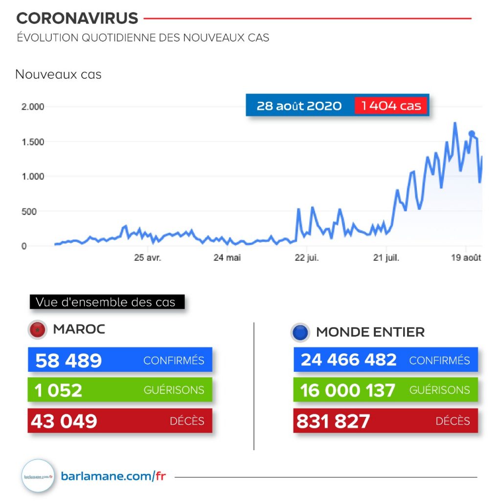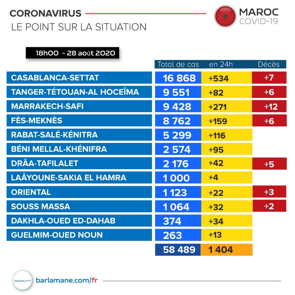 Le nouveau bilan porte à 58 489 le nombre de contaminations dans le Royaume depuis le premier cas signalé le 2 mars et à 43.049 celui des personnes totalement rétablies, a précisé le coordonnateur du Centre national des opérations d’urgence de santé publique au ministère de la Santé, Mouad Mrabet.