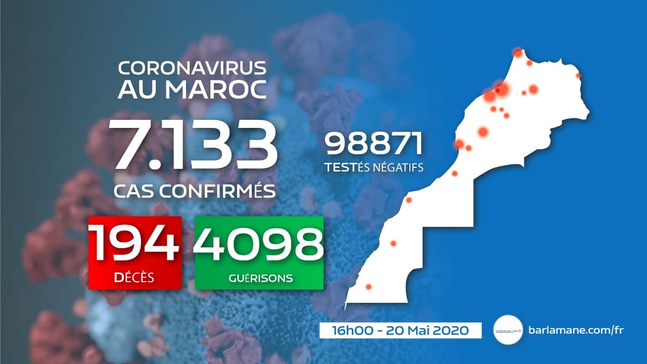 Le Maroc, selon le dernier comptage, affiche désormais 7.133 cas confirmés, 4.098 guérisons, 194 décès, 98.871 cas exclus (+1004).