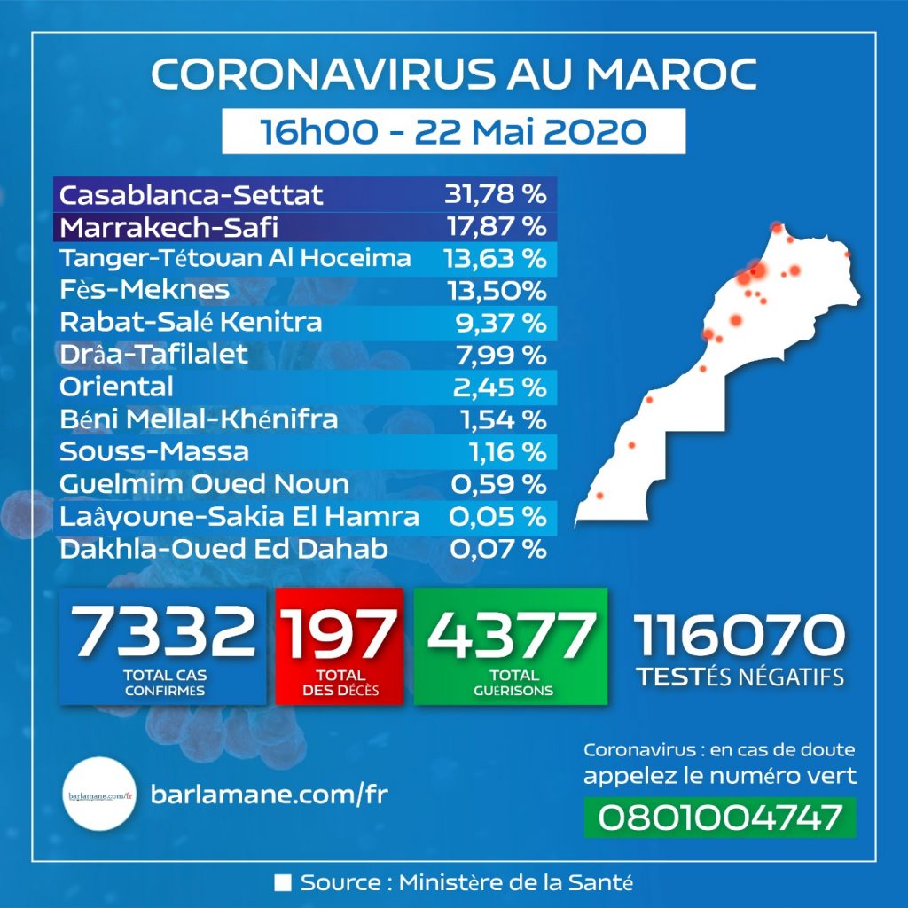 Le nombre total de cas officiellement déclarés au Maroc depuis l’apparition de la pandémie est de 7.332, avec 197 décès.