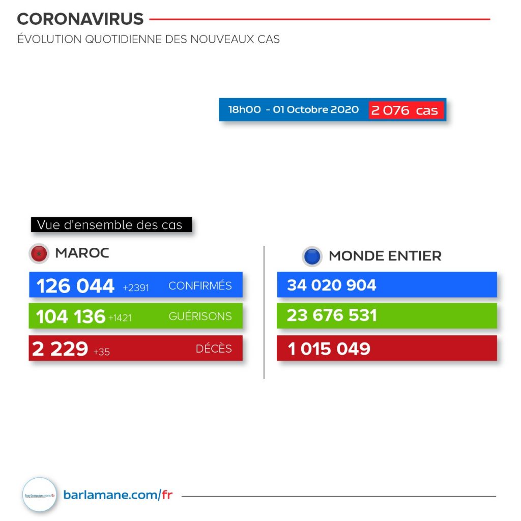 Le nouveau bilan des cas confirmés porte à 126 044 le nombre de contaminations dans le Royaume depuis le premier cas signalé le 2 mars et à 104.136 celui des personnes totalement rétablies, soit un taux de guérison de 82,6%, a précisé le ministère dans son bulletin quotidien de la Covid-19.