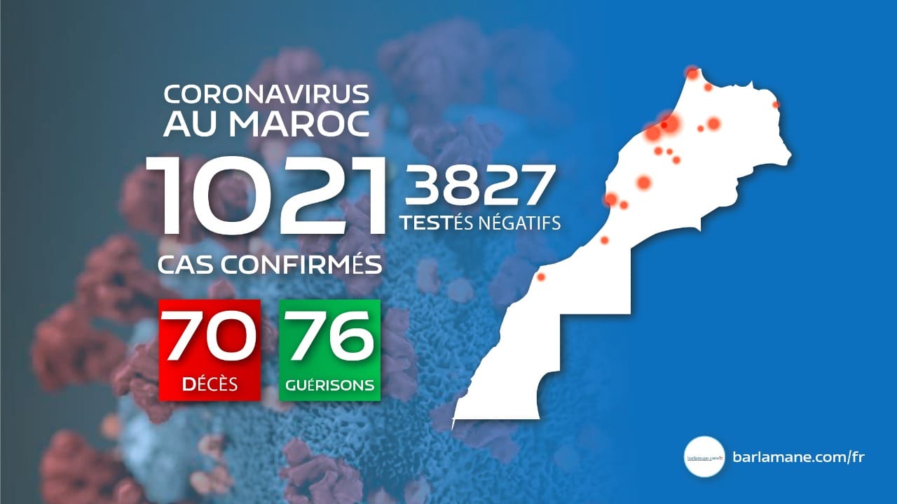 1.021 cas d’infection ont été détectés au Maroc depuis le début de l’épidémie qui a fait jusqu’à présent 70 morts et 76 guérisons, selon un bilan établi par le ministère de la Santé, aujourd’hui, à 21h00. Quant au nombre total des cas exclus après des résultats négatifs d’analyses effectuées au laboratoire, il s’élève à 3.827.