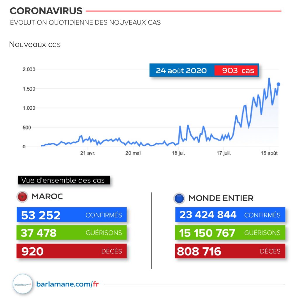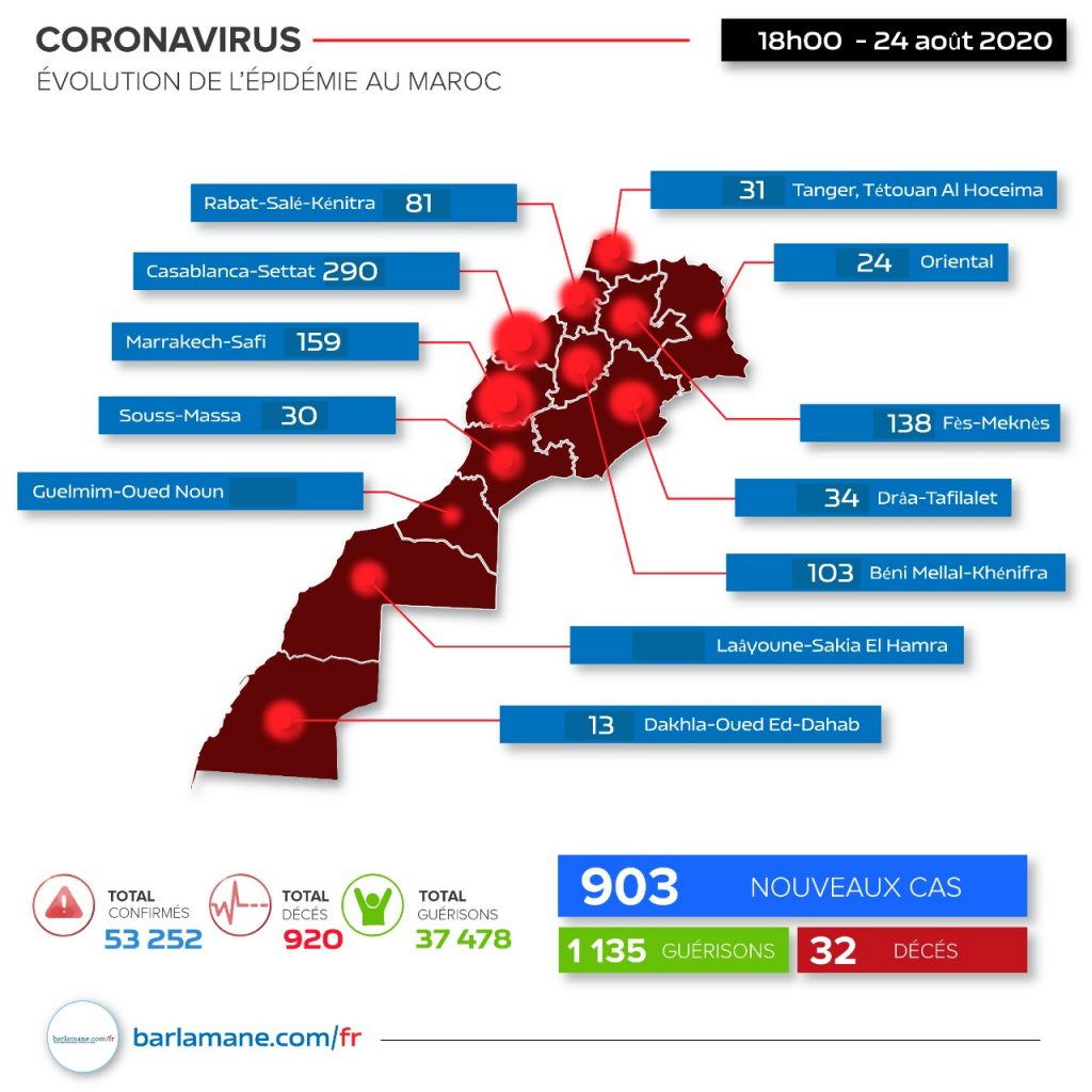 Neuf cent trois (903) nouveaux cas d’infection au coronavirus (Covid-19) et 1 135 guérisons ont été enregistrés au Maroc au cours des dernières 24 heures, a annoncé lundi le ministère de la Santé.