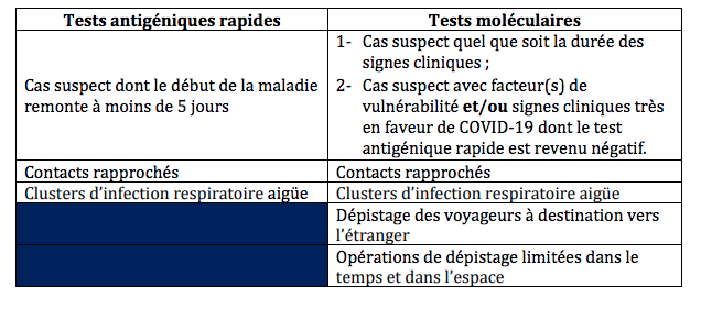 Par conséquent, les personnes ciblées par cette opération, notamment les malades présentant un tableau clinique suspect, les contacts rapprochés des cas confirmés d’infection et les clusters d’infection respiratoire aigüe, entre autres, représentent le seuil minimum de testing, calculé tenant compte de l’objectif opérationnel de couverture par les tests de confirmation, la situation épidémiologique actuelle et la production actuelle en termes en testing.