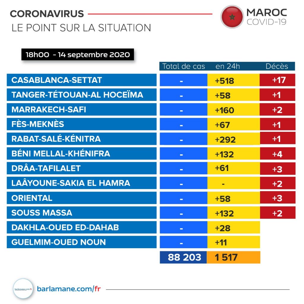Ce nouveau bilan porte à 88.203 le nombre de contaminations dans le Royaume depuis le premier cas signalé le 2 mars et à 68.970 celui des personnes totalement rétablies, soit un taux de guérison de 78,2%, a précisé le ministère dans son compte rendu quotidien.