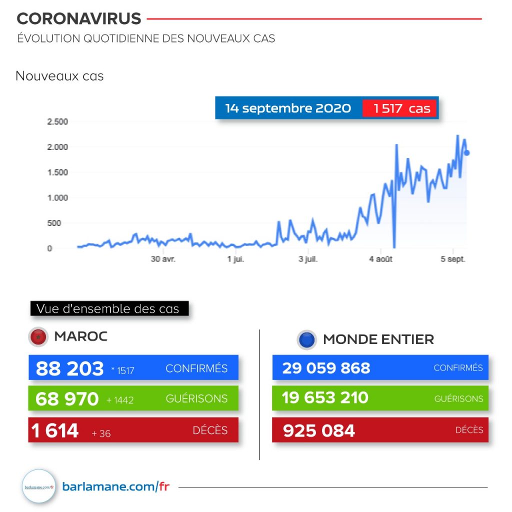 Mille cinq cent dix sept (1.517) nouveaux cas d’infection au coronavirus (Covid-19) et 1.442 guérisons ont été enregistrés au Maroc au cours des dernières 24 heures, a annoncé lundi le ministère de la Santé.