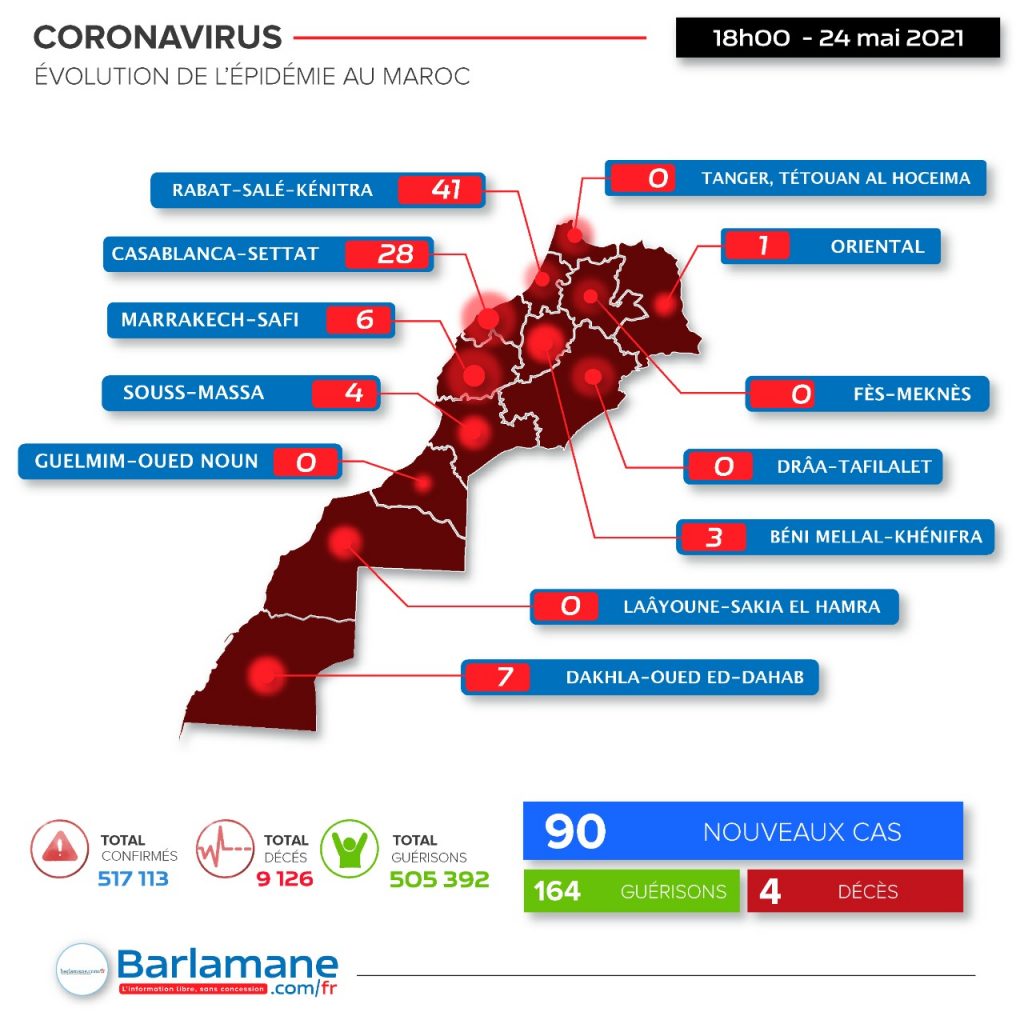90 nouveaux cas d’infection au coronavirus et de 164 guérisons ont été enregistrés au cours des dernières 24 heures au Maroc.