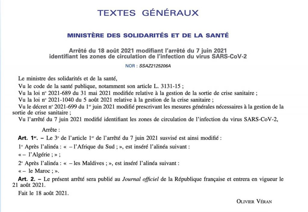 L’arrêté identifiant les zones de circulation de l’infection du virus SARS-CoV-2 a été modifié mercredi pour y inclure le Maroc ainsi que l’Algérie. « Le présent arrêté sera publié au Journal officiel de la République française et entrera en vigueur le 21 août », précise l’arrêté ministériel.