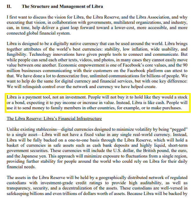 Facebook a également précisé que le Libra n’est pas destiné à être utilisé comme outil d’investissement. Lors de l’audition de David Marcus devant le Congrès américain, le Chef du projet Libra a précisé que « Libra n’est qu’un outil de paiement et non pas un outil d’investissement. Libra, c’est comme de la monnaie. Les utilisateurs vont l’utiliser pour envoyer de l’argent aux membres de leurs familles qui résident dans d’autres continents ou pour effectuer des achats par exemple », peut-on lire sur son témoignage qui a été publié sur le site du Congrès américain.