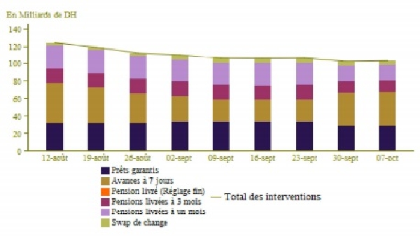 Dans ce contexte, Bank Al-Maghrib a adapté l’encours global des interventions à 105,1 milliards de dirhams, incluant principalement 27,8 milliards de dirhams à travers les avances à 7 jours, 39 milliards de dirhams sous forme d’opérations de pension livrée, 32,6 milliards dans le cadre du programme de soutien au financement de la très petite, petite et moyenne entreprise (TPME) et 5,6 milliards de dirhams au titre des opérations de swap de change, indique ce document, qui précise que le taux interbancaire s’est établi à 1,5% en moyenne.