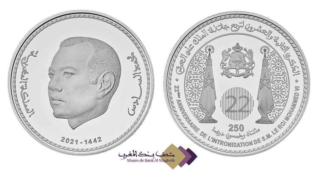 Bank Al-Maghrib (BAM) a annoncé, jeudi, l’émission d’une pièce commémorative, en argent, d’une valeur faciale de 250 dirhams à l’occasion du 22ème anniversaire de l’intronisation du roi Mohammed VI.