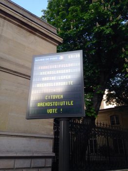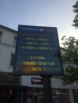 À deux jours du premier tour des élections présidentielles, plusieurs panneaux d’affichage lumineux de la ville de Paris ont adressé des messages au candidat François Fillon ainsi qu’à Marine Le Pen.