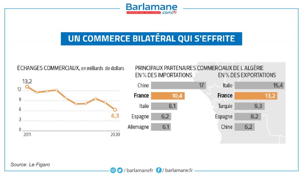 Relations qui patinent. «L’Algérie demande par exemple depuis des années à son partenaire français qu’il investisse sur le marché algérien. Ce que les autorités algériennes ne comprennent pas, c’est que ces investissements sont le fait en grande partie de la décision de privés dans laquelle le politique n’intervient pas», souligne un spécialiste algérien de la relation bilatérale interrogé par Le Figaro. La question mémorielle ? «Il faut bien reconnaître qu’on ne comprend pas vraiment ce que veulent les Algériens. Ce n’est pas très lisible», commente un éditorialiste algérois.