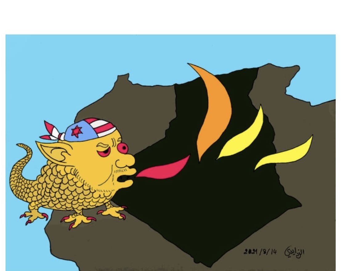 Le Maroc s’est dit disposé à aider l’Algérie pour lutter contre les incendies meurtriers qui font rage dans le nord du pays. Dans un dessin à charge antisémite, publié sur un blog de Médiapart par le caricaturiste controversé Abdellatif Zeraïdi, on voit un dragon portant une kippa avec une étoile de David cracher du feu à l’envers de l’Algérie depuis le Maroc, un dessin signalé par plusieurs lecteurs et dénoncé par Conspiracy Watch.
