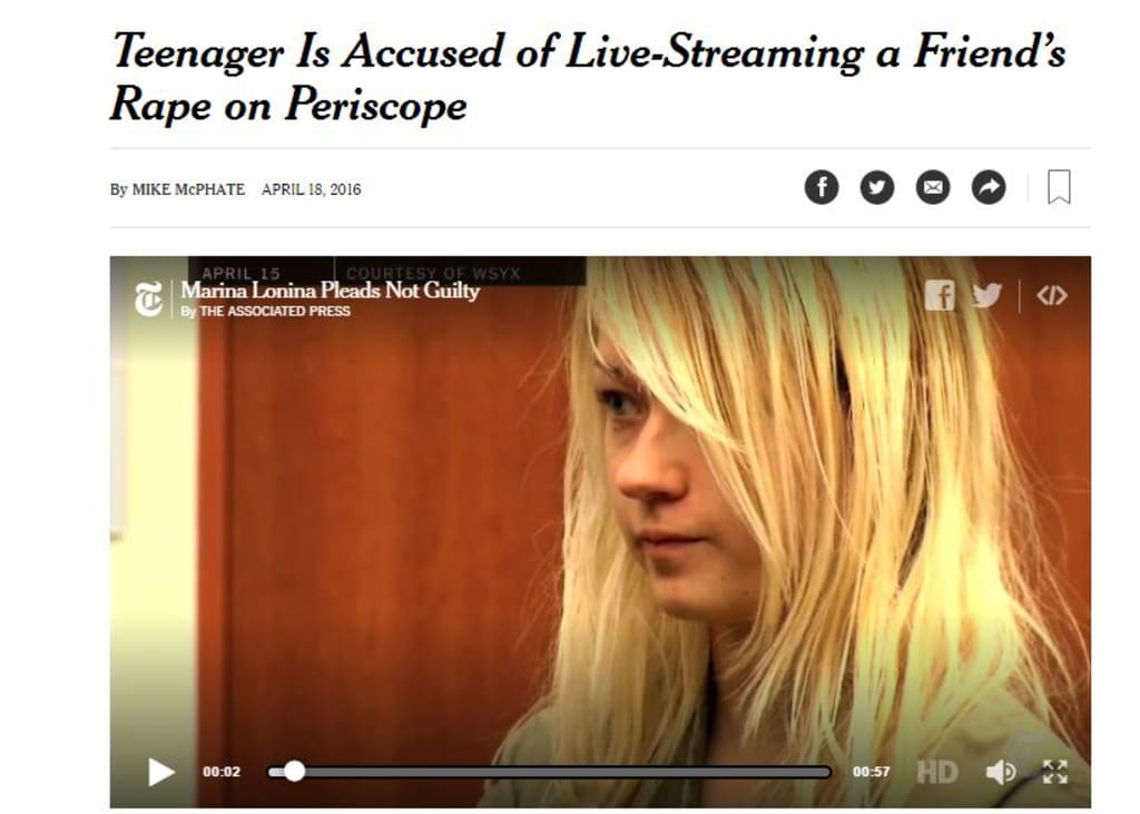 Une américaine de 18 ans nommée ‘’ Marina Alexeevna Lonina’’ risque actuellement 40 ans de prison pour avoir filmé le viol de son amie sur l’application Periscope.