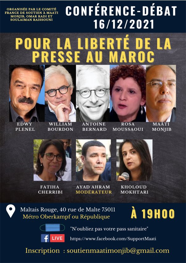 Au moment où plusieurs affaires judiciaires seront traitées ce mois au Maroc, Edwy Plenel, William Bourdon, Rosa Moussaoui, et Maâti Monjib organisent une conférence-débat en France, le 16 décembre, non pas sur, mais pour la liberté de la presse au Maroc. C’est deuxième le événement organisé après le premier une soirée tenue par L’Humanité le 25 octobre à la Bourse du travail de Paris. Écrans de fumée.