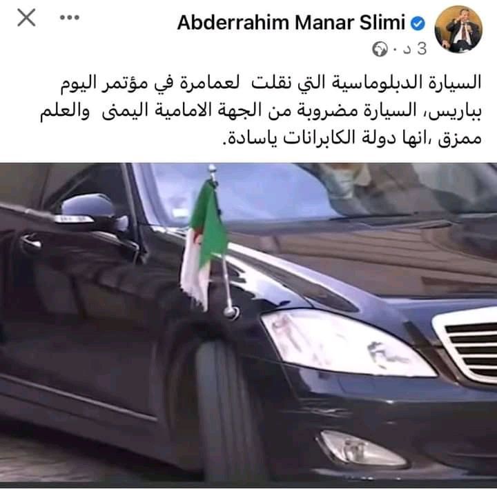 Le véhicule diplomatique ayant conduit le ministre algérien des affaires étrangères Lamamra Ramtane, à la conférence sur la Libye à Paris a été cabossé sur le devant et le drapeau a été amoché. Comme quoi, lAlgérie qui entend peser sur le dossier libyen est à l’état du véhicule diplomatique : abîmée.