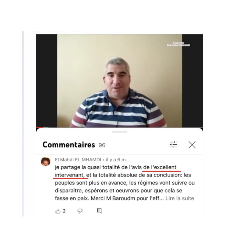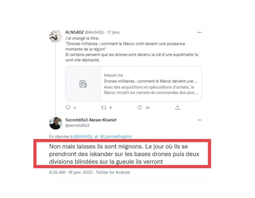 Ou encore par John le Carré de la Twitoma et préposé de « Mamfakinch », Mahdi El Mhamdi qui juge « excellentes » les interventions médiatiques de Kharief, surtout lorsqu’il menace d’exploser la gueule du Maroc.