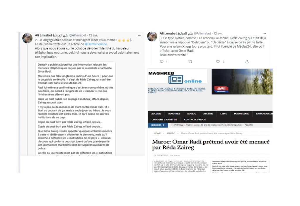 Ca c’est de l’investigation a khay Lmrabet !!! Mais faire dire à tes soldats de plomb que Dbibina c’est Reda Zaireg pck le premier avait le symbole du ruban sur son compte twitter et que le second aime en porter dans la vie de tous les jours….Ca c’est de l’investiCONNERIE !!!