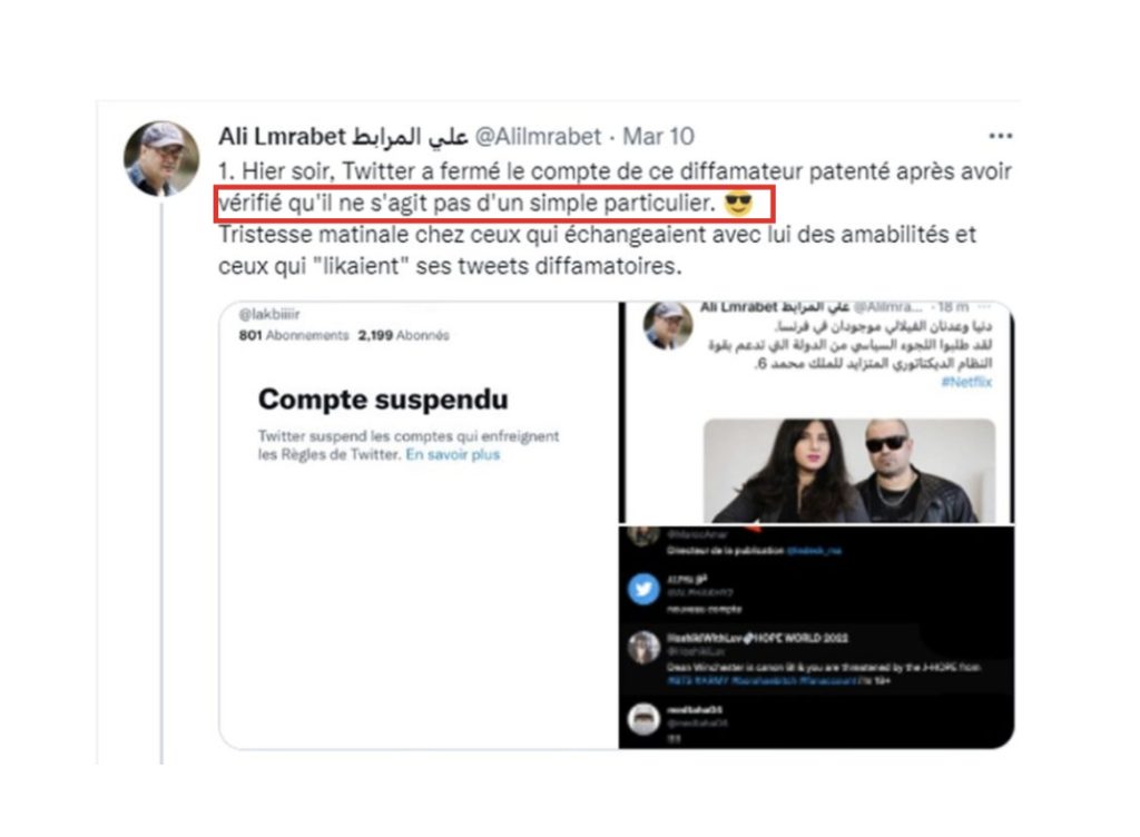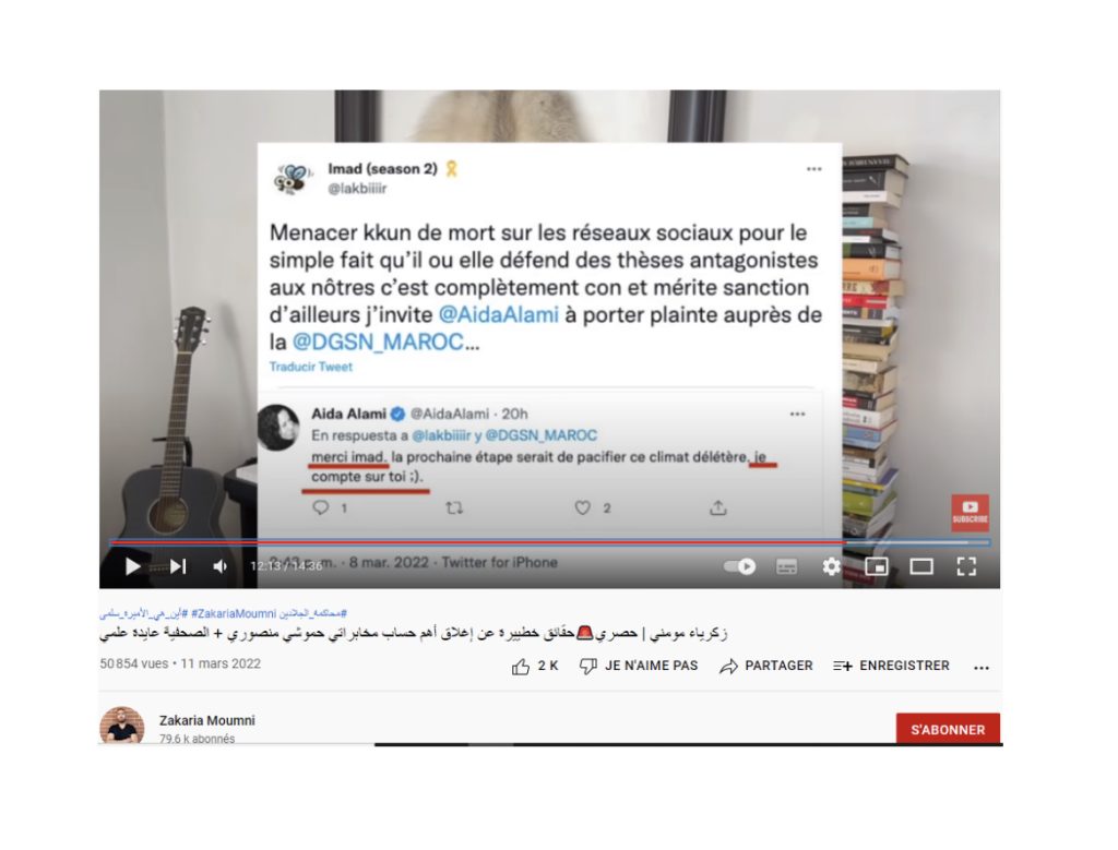 La fois d’après tu insinues (à travers la voix de Zakaria Moumni) que Aida Alami a peut-être kkchose à voir avec mon compte juste pck elle m’aurait dit « Merci », après que je l’ai soutenu face aux menaces qu’elle dit avoir reçu sur twitter