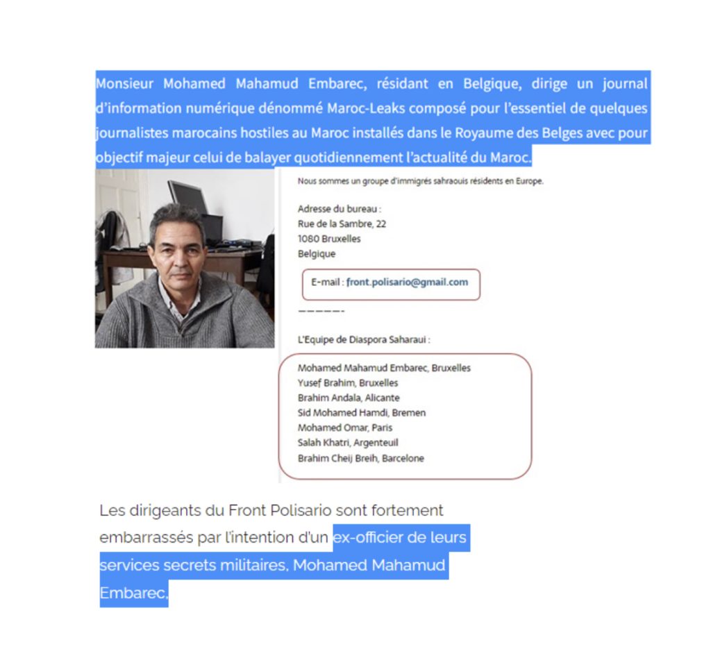 Ce même Mohamed Mahamus Embarec gère également le site « Maroc-leaks », l’une des boîtes à lettres d’Ali Lmrabet, qui n’a toujours pas compris : « qu’à souteneur, Dbibina et demi »…