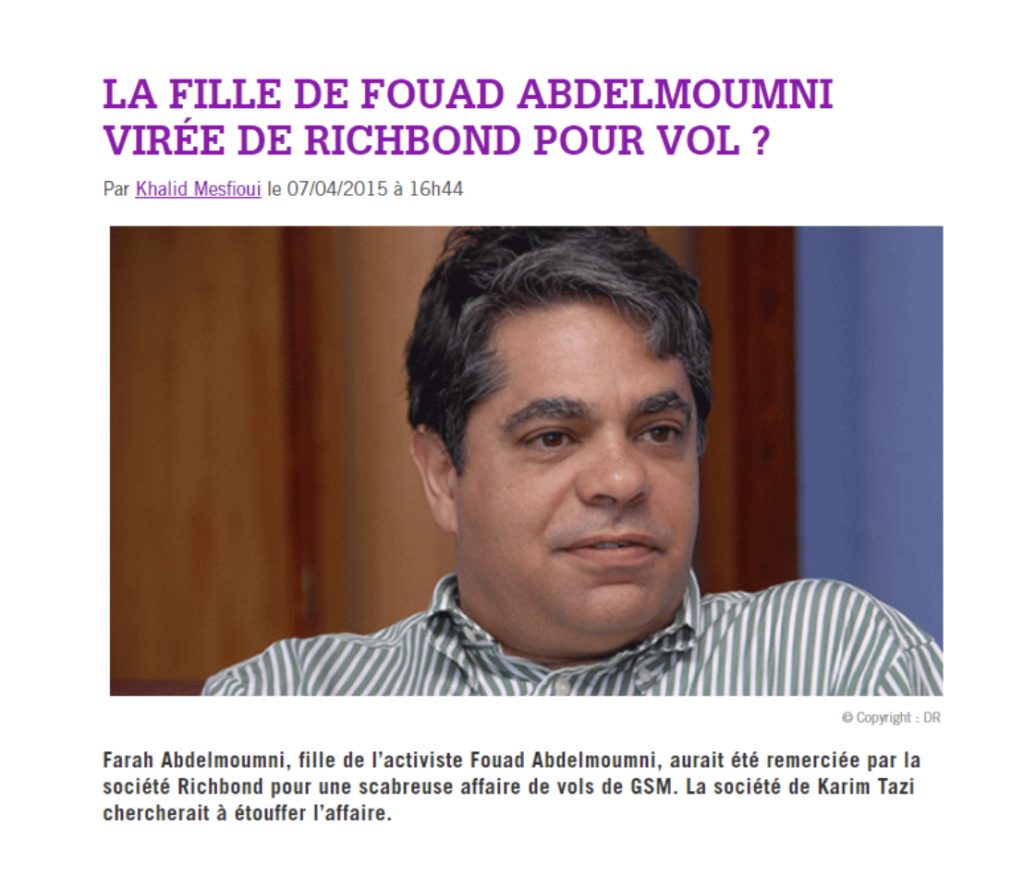 11-L’oligarque Abdel-Moue Trique, et ex-El Comandente de Transparency Maroc, va-t-il nous la jouer « A Bas le Népotisme…Sauf pour la prunelle de mes yeux » ? Celle qu’Abdel-Moue Trique a pistonné chez Moul Sdadr avec un bon salaire, mais qui a fini par la virer lorsqu’il l’a coincé en train de piquer les portables de l’entreprise.