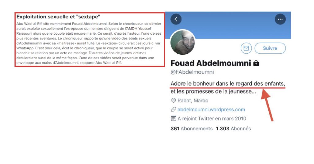 5-Pour ce qui est de la situation des droits de l’homme au Maroc, si le bourreau du syndicaliste Noubir Amaoui et du journaliste Boubker Jamai, avait insisté lors de son passage sur Doumia TV, sur son droit inaliénable d’envoyer, via WhatsApp, des photos de lui en petite tenue à une cliente des Émirats qu’il a dit ne pas connaître, eh bah je suis certain que Fouad-Abel-moue-trique fera preuve certainement de moins d’extravagance, pour nous édifier sur la mobilisation surprenante d’un bon père de famille, dans la défense inconditionnelle de celui qu’il sait pourtant qu’il a abusé de la prunelle de ses yeux lorsqu’il jouait avec elle à « Pile ou Fesses » et « Touche-Pipi ».