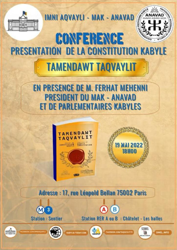 L’Agence kabyle d’information a indiqué qu’après deux années de travail intense, le MAK, l’Anavad et le Parlement de Kabylie ont « l’immense honneur de présenter la Constitution kabyle au peuple kabyle et à la communauté internationale, le jeudi 19 mai, à partir de 18 heures, au 17 rue Léopold Bellan, dans le deuxième arrondissement à Paris. Et ce, au cours d’une conférence présidée par Farhat Mehenni.