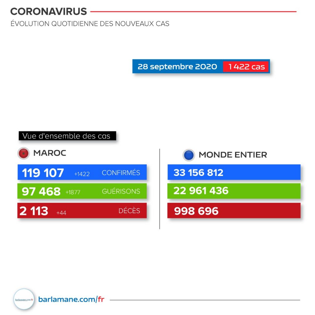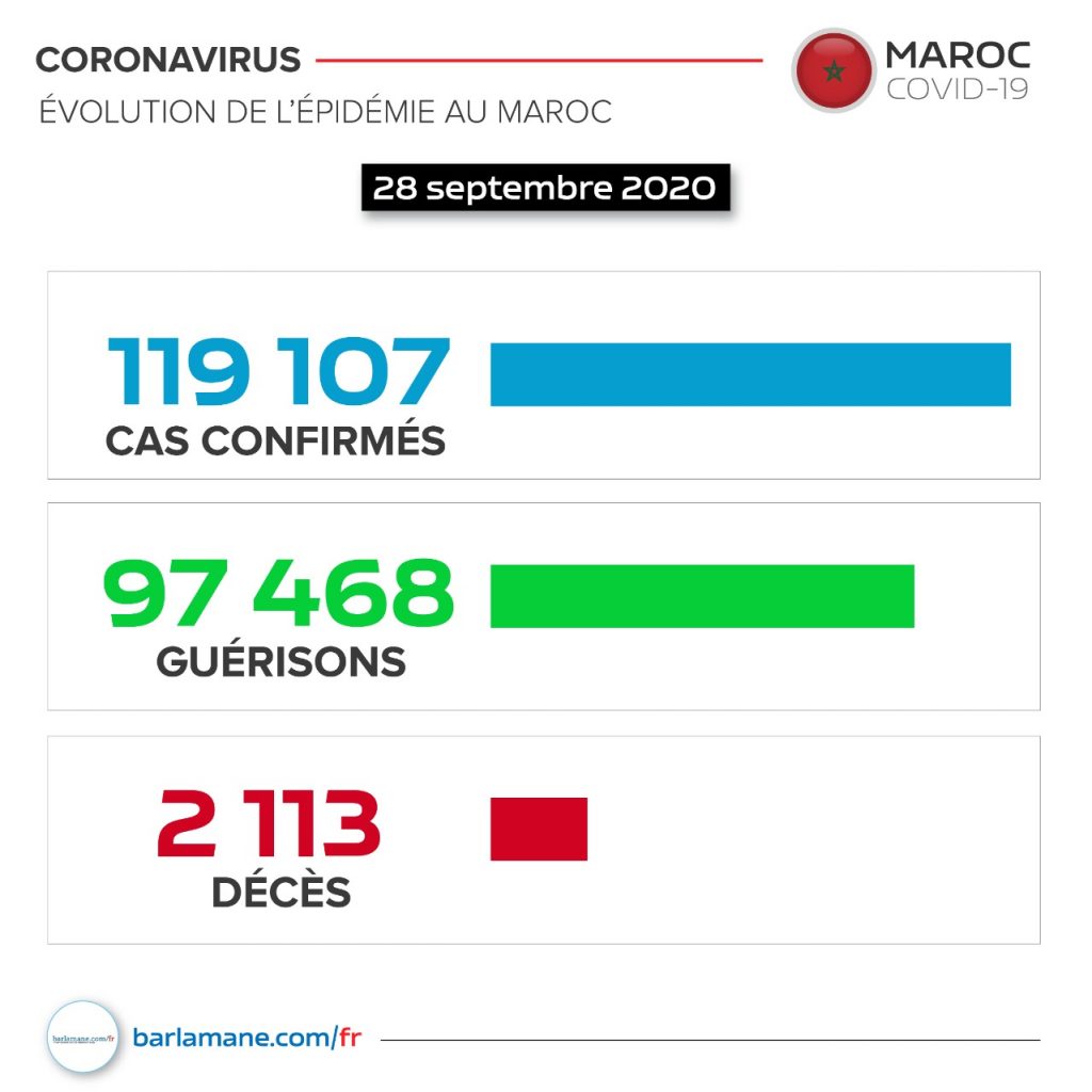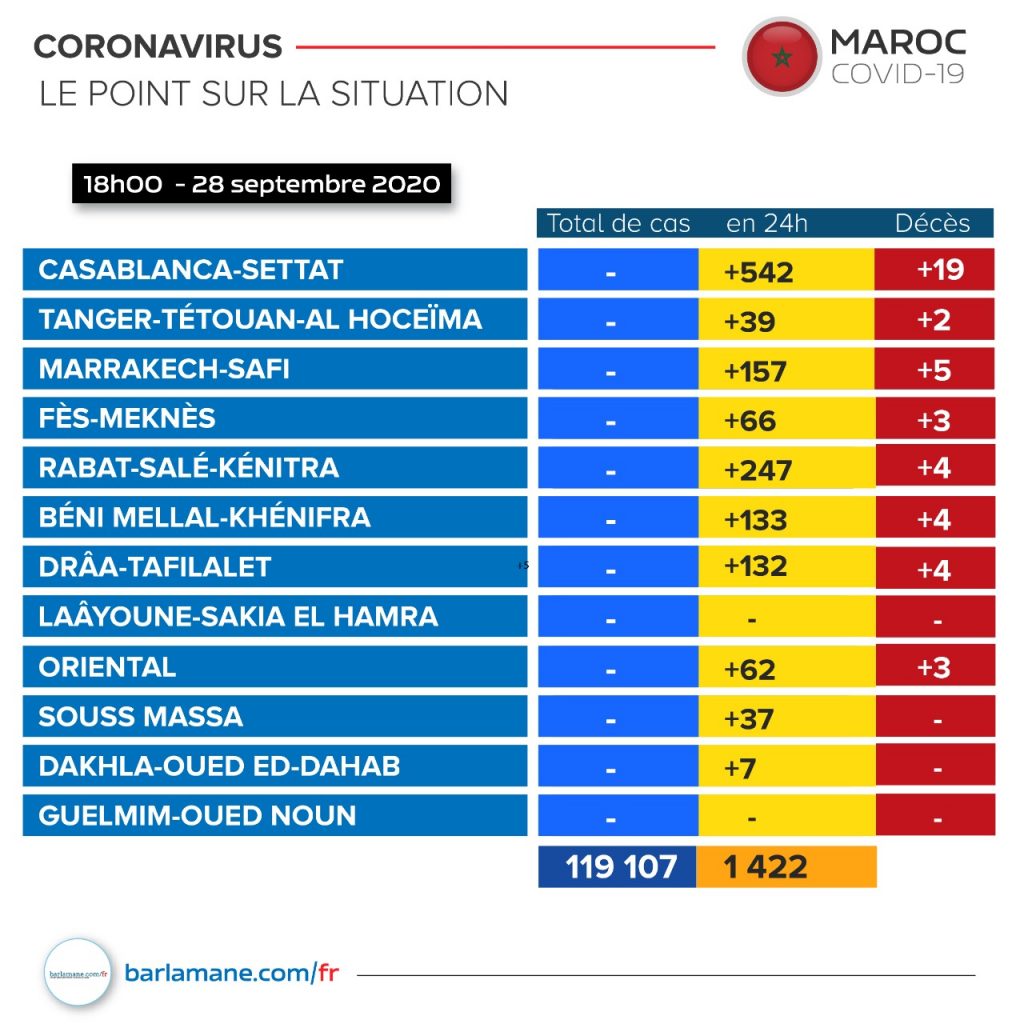 1 422 nouveaux cas d’infection au nouveau coronavirus ont été confirmés au Maroc jusqu’à 18h00, portant à 119 107 le nombre total des cas de contamination, annonce le ministère de la Santé.