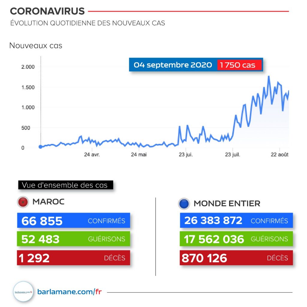 Depuis le comptage réalisé hier à 18h00, 1750 nouveaux cas ont été recensés au Maroc. Le nombre de rémissions s’est établi à 52483 alors que le bilan des décès s’élève à 1292.