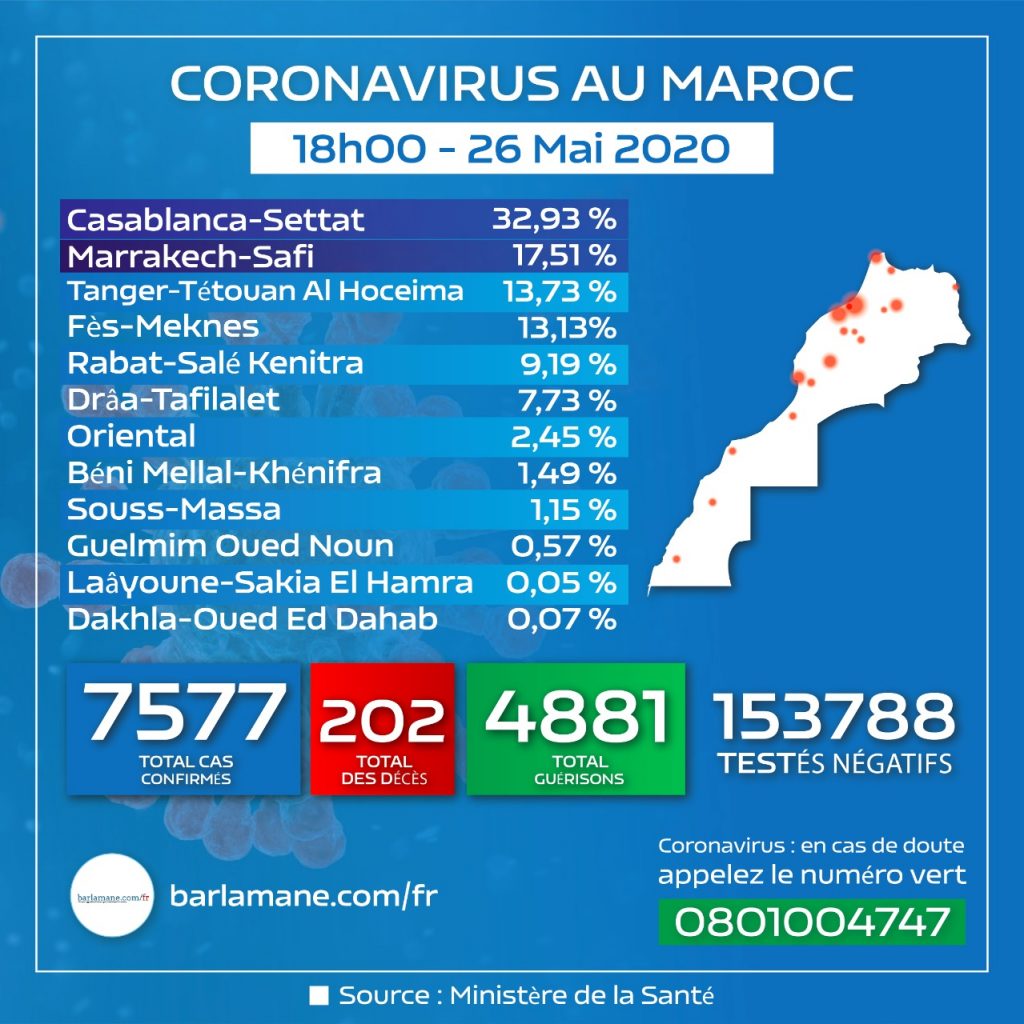 7.577 cas d’infection ont été détectés au Maroc depuis le début de l’épidémie qui a fait aujourd’hui 2 décès et 107 guérisons, selon un bilan établi par le ministère de la Santé, aujourd’hui, à 18h00.