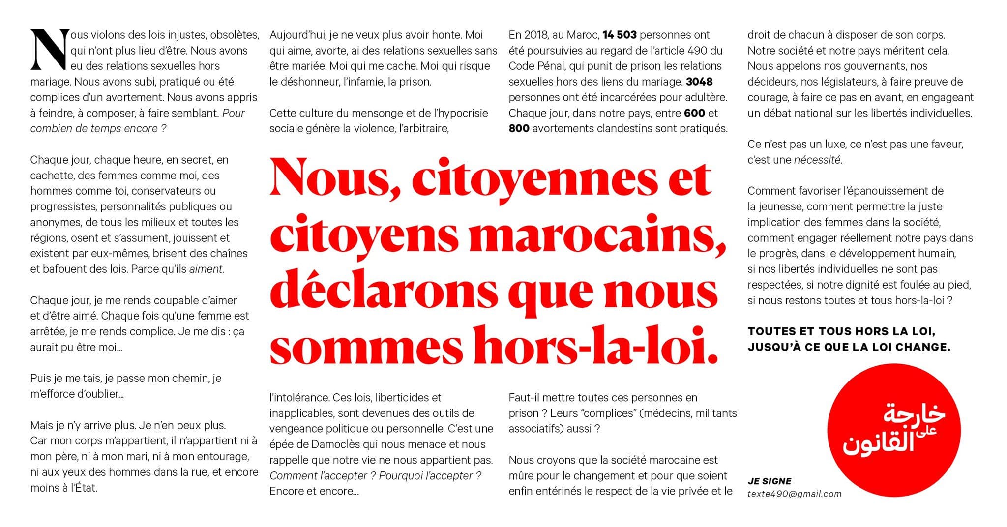 Le mouvement des « Hors-la-loi » (collectif 490), initié par l’écrivaine Leïla Slimani et la réalisatrice Sonia Terrab, a gagné le prix Simone de Beauvoir pour la liberté des femmes. Le prix sera remis le 9 janvier prochain à la Maison de l’Amérique latine à Paris.