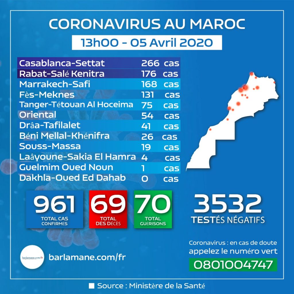 961 cas d’infection ont été détectés dans les régions marocaines depuis le début de l’épidémie qui 69 a fait morts, selon un bilan établi par les autorités sanitaires dimanche à 13h00.
