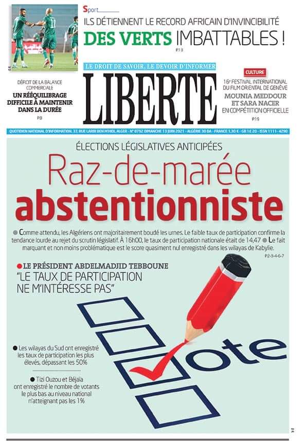 Liberté, le quotidien généraliste algérien en langue française est sans équivoque : «Raz-de-marée abstentionniste». Les Algériens ont voté samedi pour choisir leurs députés lors d’élections législatives anticipées imposées par le régime, un scrutin rejeté par le mouvement contestataire du Hirak et une partie de l’opposition, et marqué à nouveau par une très forte abstention. «En cette matinée d’un samedi caniculaire, peu de gens se bousculaient au portillon de ce centre. Les rares électeurs qui ont glissé leur bulletin dans l’urne se comptaient sur les doigts de la main» dévoile Liberté.