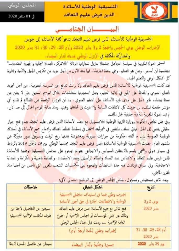La Coordination nationale des enseignants contractuels a annoncé, dans un communiqué, que 6 jours de grève nationale sont prévus durant le mois de janvier, et ce, du 28 au 31 janvier.