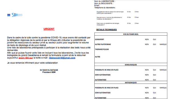 Dans ce sens, le Syndicat des biologistes médicaux de Casablanca (SBM) a envoyé un document aux laboratoires affirmant qu’il a été contacté par la délégation régionale de la Santé et par la Wilaya afin d’étudier la possibilité de joindre les ressources du secteur privé au secteur public pour augmenter le volume de tests de dépistage et de suivi réalisé. Le but est de recenser les laboratoires prêts, en terme de matériel et de conditions sanitaires pour le dépistage. Les laboratoires doivent ainsi indiquer s’ils ont la possibilité de mettre en place un service « drive », un service de prélèvement à l’extérieur et s’ils disposent d’une plateforme de biologie moléculaire. Ils doivent aussi souligner s’ils ont la capacité d’effectuer des tests PCR (test GeneXpert ou autres plateformes) et s’ils disposent d’un thermocycleur pour les réaliser. Il s’agit aussi de savoir si ces laboratoires peuvent réaliser des tests sérologiques et antigéniques.