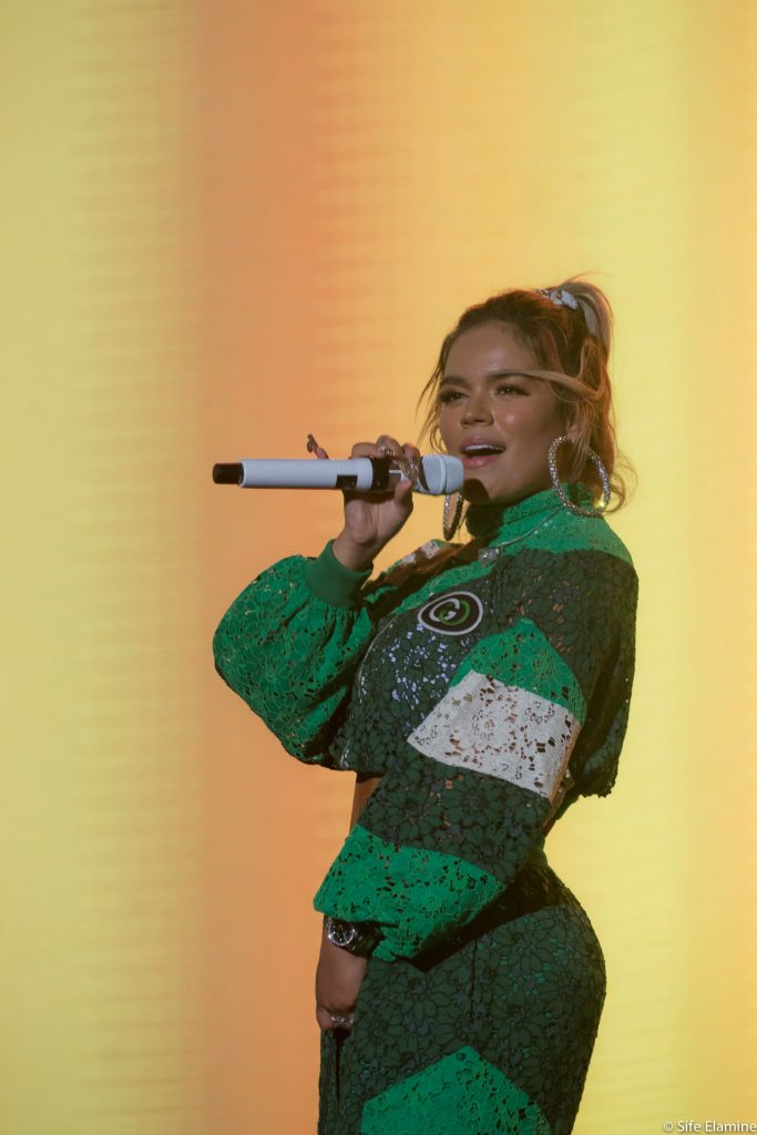 De son tour, la jeune chanteuse Karol G, qui a entamé la première partie de la soirée, n’a pas manqué de révéler avant de chanter chaque chanson, le vécu derrière ses compositions. Dans sa tenue verte pailletée, ses trainers hautes et ses ongles chatoyants chante, Karol a été impressionnée par le public qui n’a eu aucun mal à reconnaître ses tubes, reprenant les refrains avec elle et partageant ses sentiments, les plus tristes comme les plus joyeux.